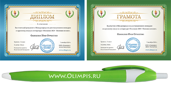 Все участники конкурса* получат печатные именные грамоты или дипломы, а также фирменную шариковую ручку «Олимпис».